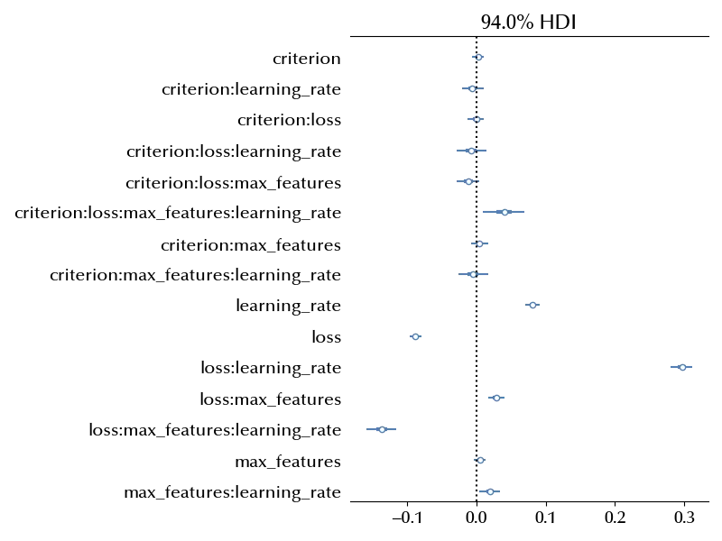 We immediately see that the only significant factors in this model are the loss and the learning rate. We have enough information in order to consider all the possible interaction terms, and this is what we will do. Building the fully interacting model is immediate with Bambi