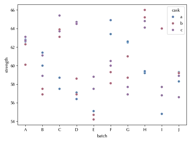 Here we want to quantify the average strength as well as the variability, and we have two sources ov variability, the batch and the cask. The cask is however nested within the batch, since cask a from batch A is not the same as cask a from batch B.